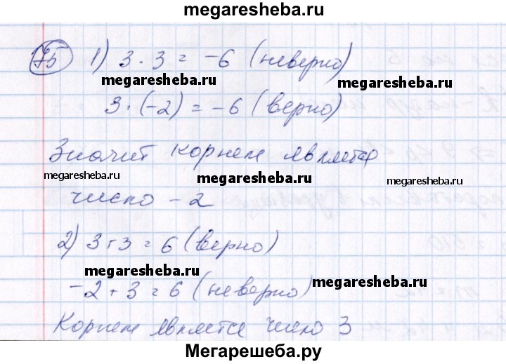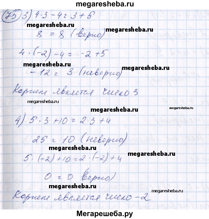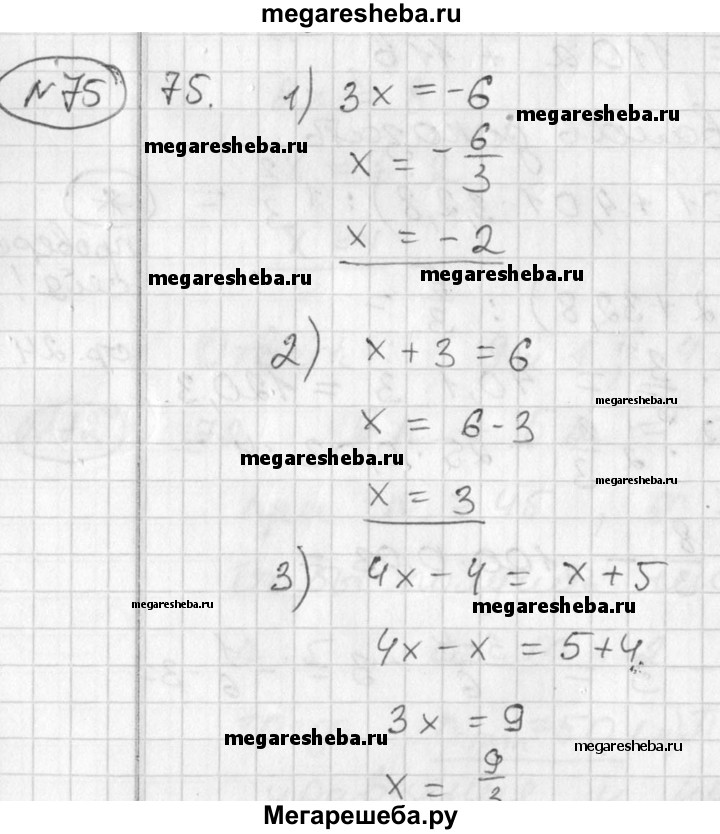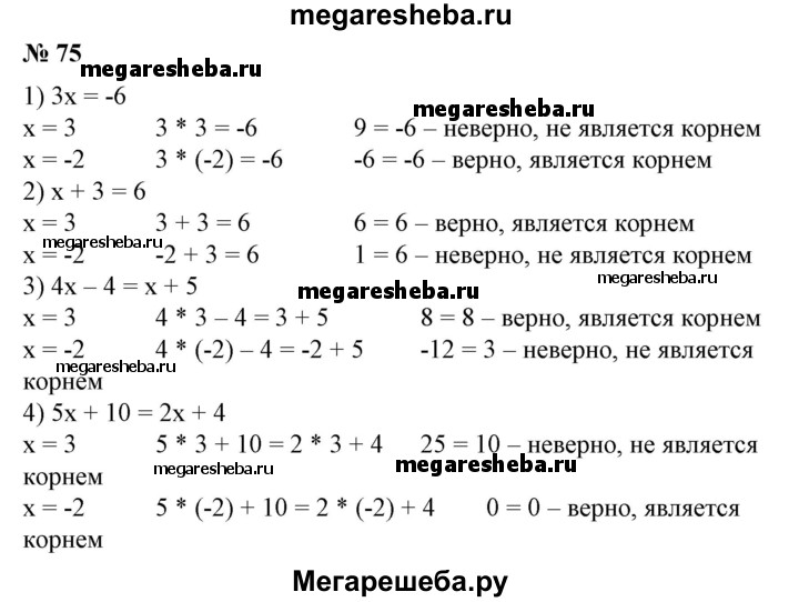 75 Какое из чисел 3; -2 является корнем уравнения: 1) 3x = -6; 2) x + 3 = 6; 3) 4х-4=x + 5; 4) 5x + 10 = 2х + 4?