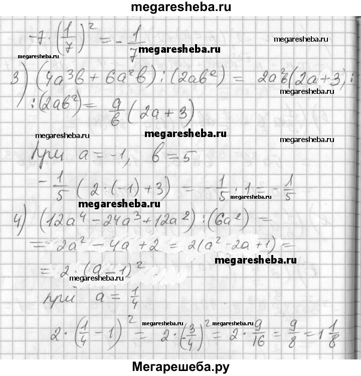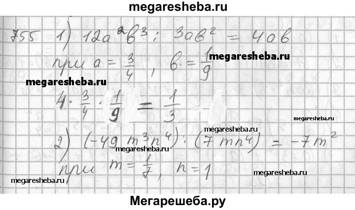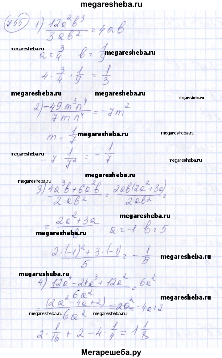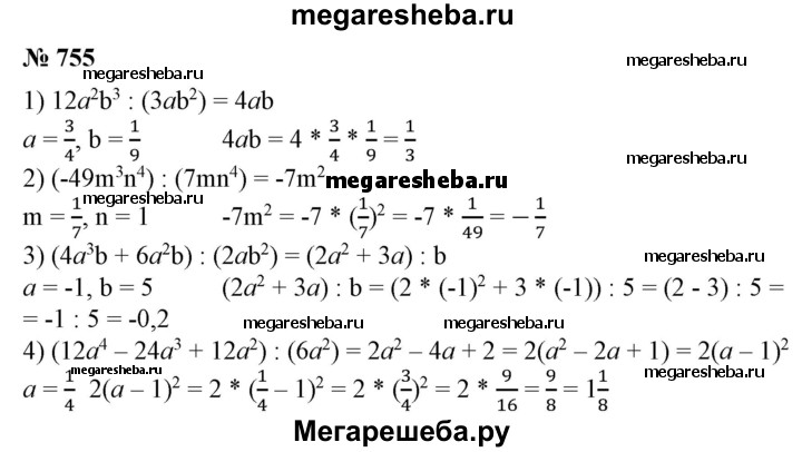755 Найти значение выражения: 1) 12a2fr3 :(3ab2) при a = 3/4, b = 1/9; 2) (-49m3a4):(7mn4) при m = 1/7, n = 1; 3) (4a3b + 6a2b):(2ab2) при а = -1, b = 5; 4) (12a4 - 24a3 + 12a3) :(6a2) nри a = 1/4.