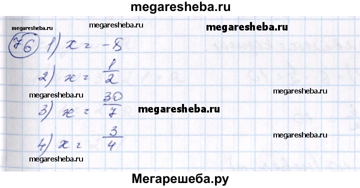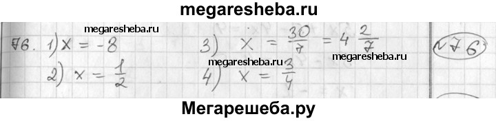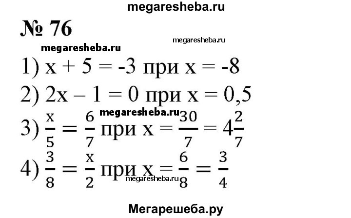 76 (Устно.) При каких значениях х уравнение обращается в верное равенство: 1) x+5 = -3; 2) 2 x-1 = 0; 3) x/5 = 6/7; 4) 3/8 = x/2?