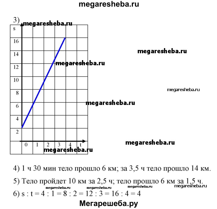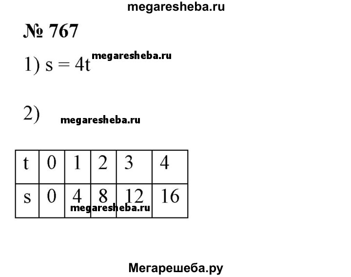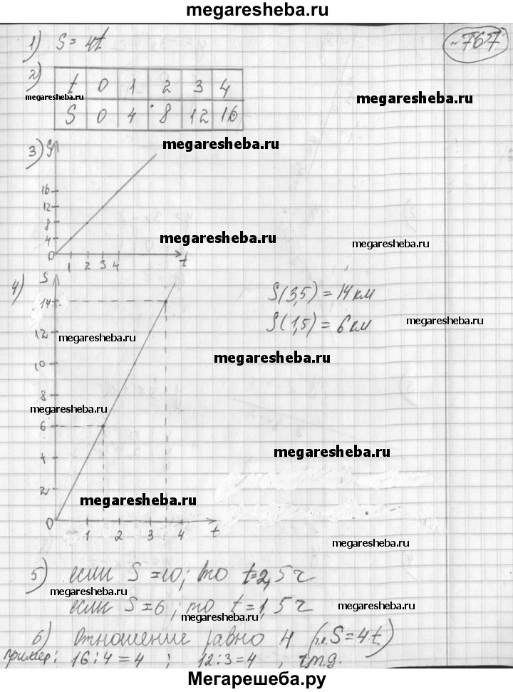 767 Тело движется равномерно со скоростью 4 км/ч. 1) Написать формулу, выражающую путь s этого тела за t часов. 2) Составить таблицу значений s при t, равном 0; 1; 2; 3; 4. 3) По данным таблицы построить график изменения пути данного тела в зависимости от изменения времени движения. 4) Найти по графику путь, пройденный телом за 1 ч 30 мин; за 3,5 ч. 5) Найти по графику, за какое время тело пройдет 10 км; 6 км. 6) Доказать, что отношение ординаты любой точки полученного графика к ее абсциссе равно 4.