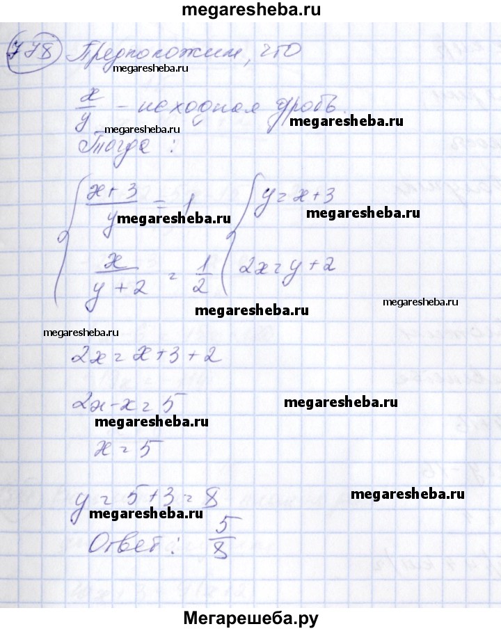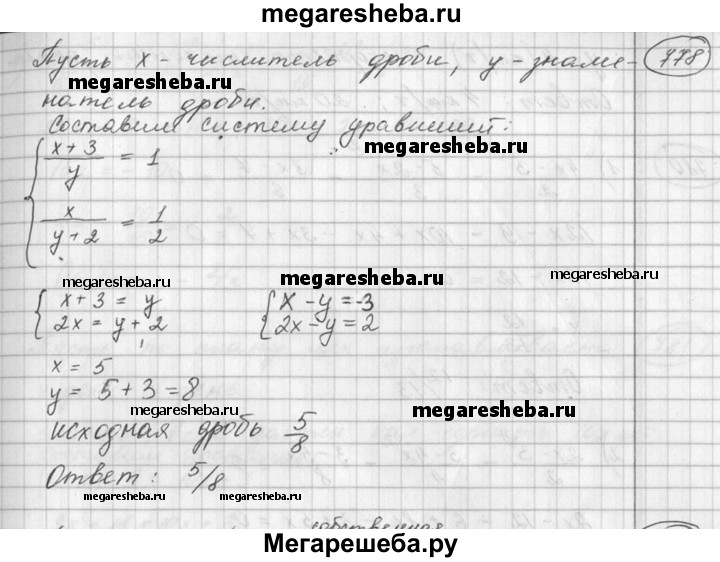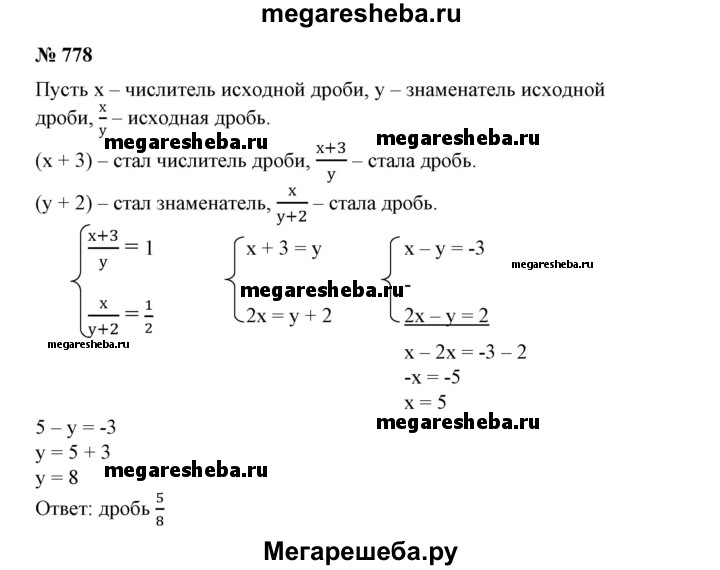 778 Если к числителю некоторой дроби прибавить 3, а знаменатель оставить без изменения, то получится 1; если к знаменателю исходной дроби прибавить 2, не меняя ее числитель, то получится дробь, равная 1/2. Найти исходную дробь.