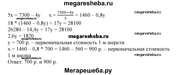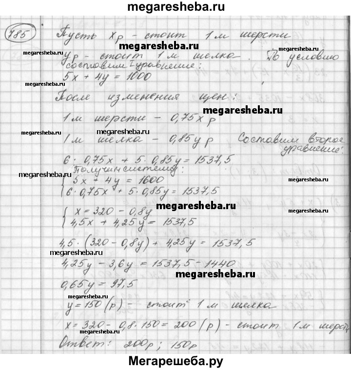 785 За 5 м шерсти и 4 м шелка в магазине «Ткани» нужно заплатить 1600 р. При передаче остатков ткани в магазин по продаже мерного лоскута цену на шерсть снизили на 25%, на шелк — на 15%, и в этом магазине за 6 м шерсти и 5 м шелка нужно заплатить 1537 р. 50 к. Сколько стоит метр шерсти и метр шелка в магазине «Ткани»?