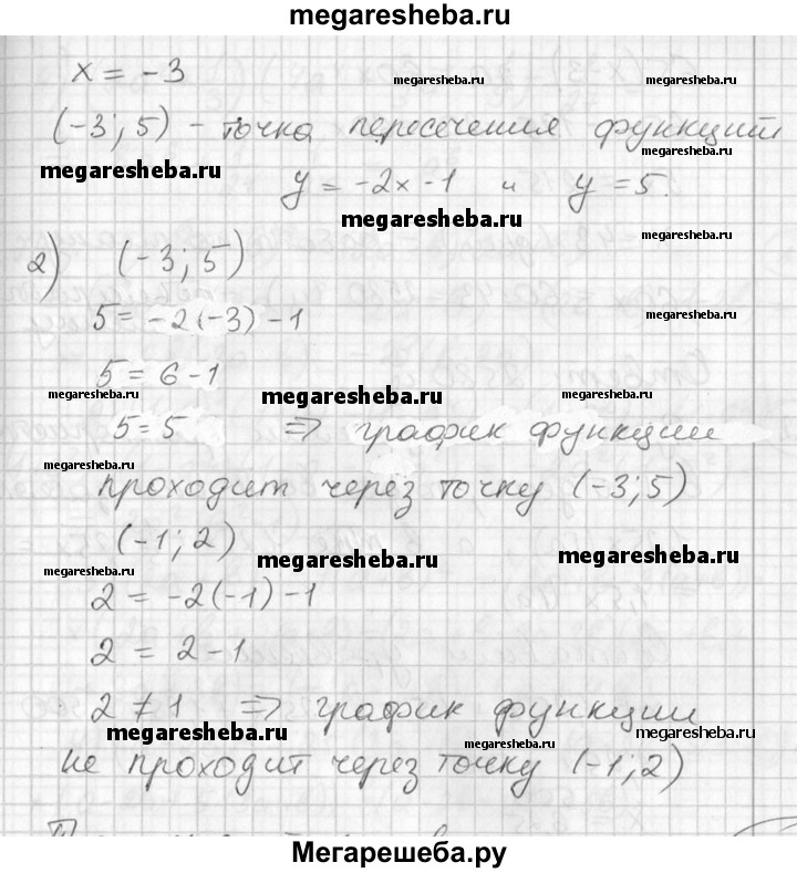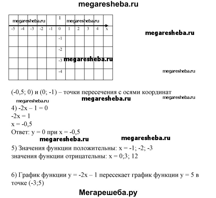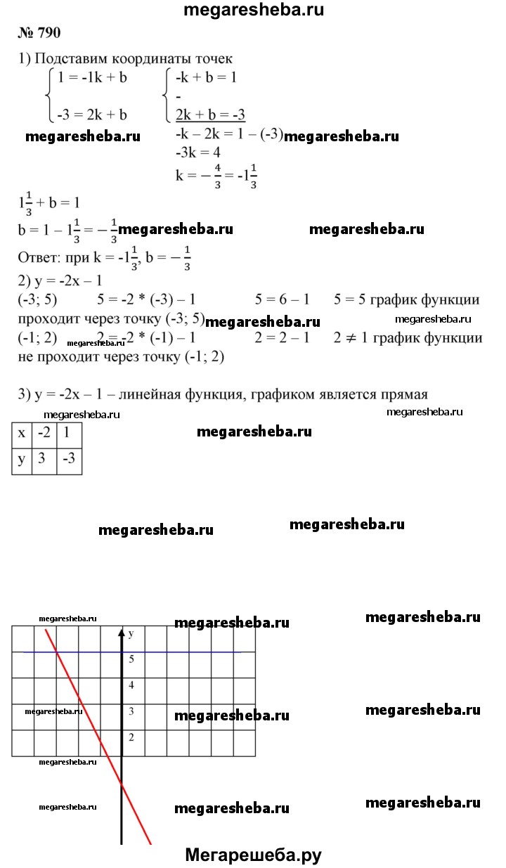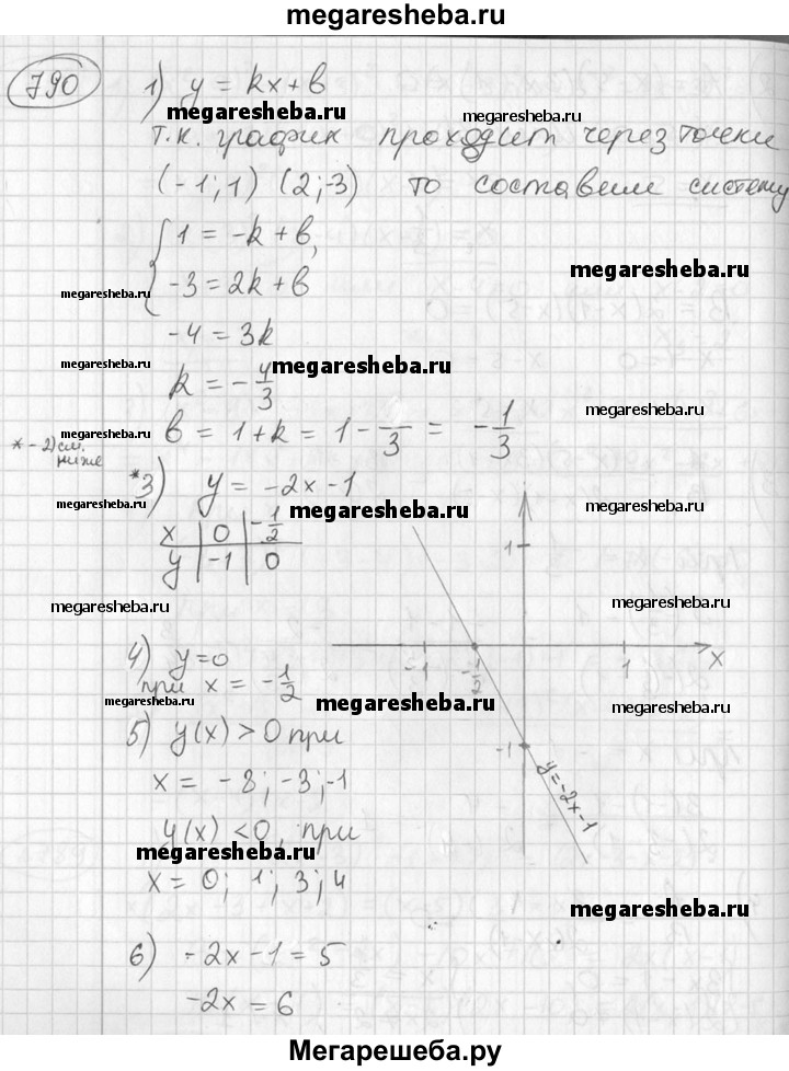 790 1) При каких значениях k и b график функции y = kx + b проходит через точки (-1; 1), (2; -3)? 2) Проходит ли график функции у = -2 х-1 через точку (-3; 5)? (-1; 2)? 3) Построить график функции у = -2 х-1. Найти координаты точек пересечения графика с осями координат. 4) При каком значении х значение функции у = - 2х-1 равно нулю? 5) Указать несколько целых значений х, при которых значения функции у = - 2х-1 положительны (отрицательны). 6) Найти координаты точки пересечения графика функции у = -2х-1 с графиком функции у = 5.