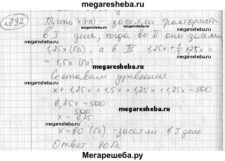 792 За 5 дней работы трактористы засеяли 500 га. Во 2-й день они засеяли на 25% больше, чем в 1-й, а в 3-й — на 20% больше, чем во 2-й. Последние два дня они засевали каждый день столько же, сколько во 2-й день. Сколько гектаров засеяли трактористы в 1-й день?
