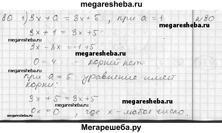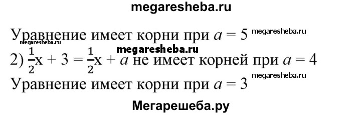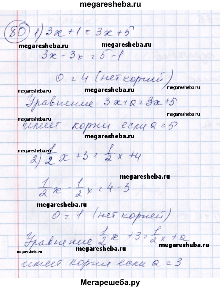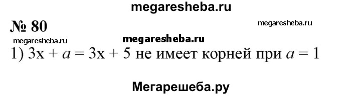 80 Выяснить, имеет ли корни уравнение при заданном значении а: 1) Зх + а = Зх + 5 при а = 1; 2) 1/2х + 3 = 1/2х + а при а =4. Указать такое значение а, при котором данное уравнение имеет корни.
