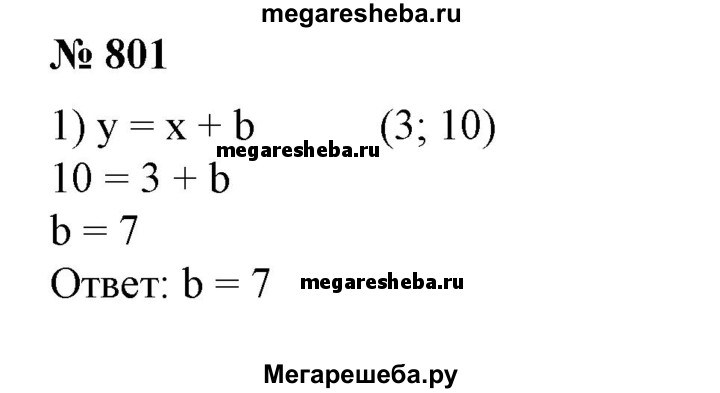 801 Определить значение Ь, если через точку с координатами (3; 10) проходит график функции, заданной формулой: 1) у=х + b; 2) у = Зх + b; 3) у= -1/3x+b 4) у = -1/2x+b