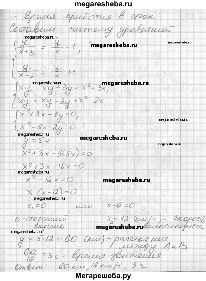 804 Велосипедист прибыл из пункта А в пункт В в назначенное время, двигаясь с определенной скоростью. Если бы он увеличил эту скорость на 3 км/ч, то прибыл бы к месту назначения на час раньше срока, а если бы он проезжал в час на 2 км меньше, чем в действительности, то он опоздал бы на час. Определить расстояние между А и В, скорость велосипедиста и время его движения.