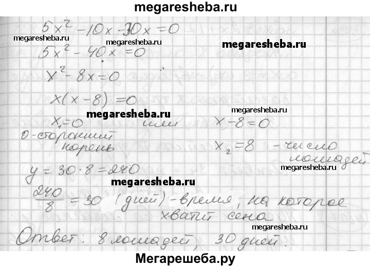 805 Для содержания лошадей был сделан запас сена на некоторое время. Если бы лошадей было на две меньше, то этого запаса сена хватило бы еще на 10 дней; если бы лошадей было на две больше, то запаса сена не хватило бы на 6 дней. Сколько было лошадей и на сколько дней был сделан запас сена?