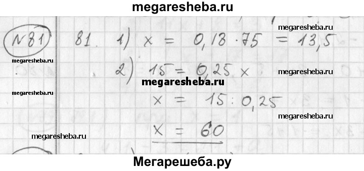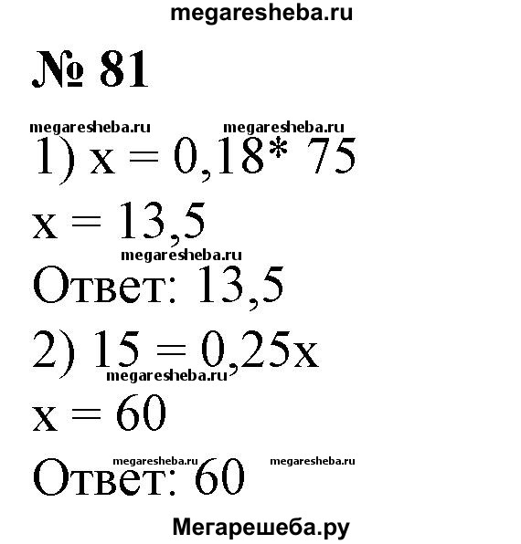 81 Записать данное утверждение в виде равенства и найти значение х, при котором равенство верно: 1) число х составляет 18% числа 75; 2) число 15 составляет 25% числа х.