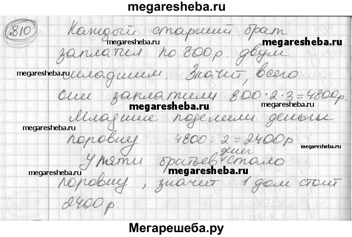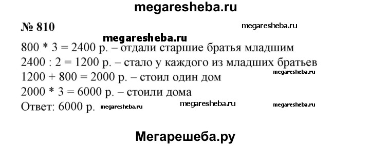 810 Пять братьев разделили после отца наследство поровну. В наследстве было три дома. Три дома нельзя было делить, их взяли старшие три брата. А меньшим за то выделили деньги. Каждый из старших заплатил по 800 рублей меньшим и тогда у всех пяти братьев денег стало поровну. Много ли стоили дома?