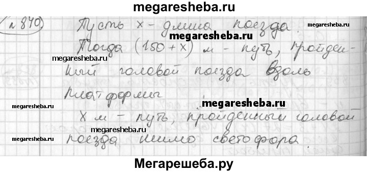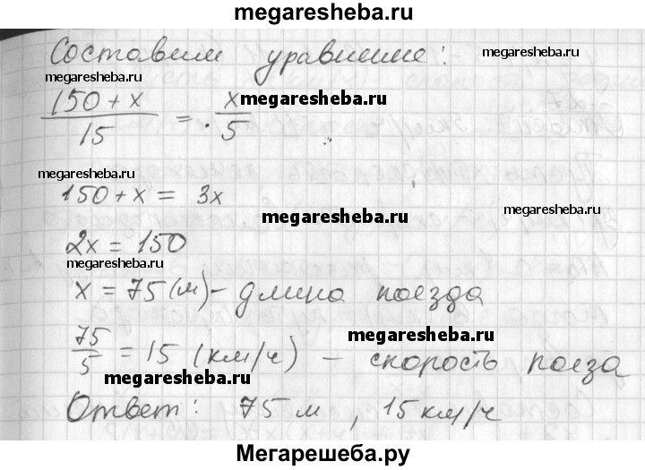 840 Электропоезд проехал мимо светофора за 5 с, а мимо платформы длиной 150 м — за 15 с. Каковы длина электропоезда и его скорость?