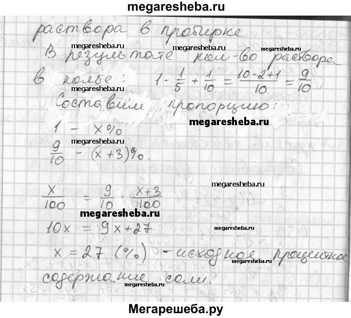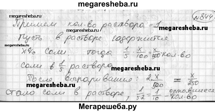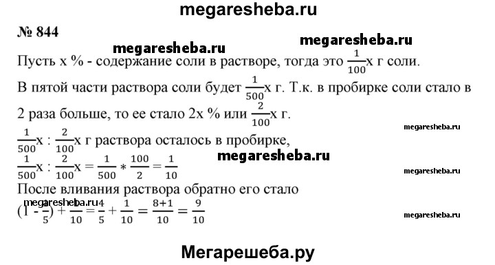 844 В колбе имеется раствор поваренной соли. Из колбы в пробирку отливают 1/5 часть раствора и выпаривают до тех пор, пока процентное содержание соли в пробирке не повысится вдвое. После этого выпаренный раствор выливают обратно в колбу. В результате содержание соли в колбе повышается на 3%. Определить исходное процентное содержание соли.