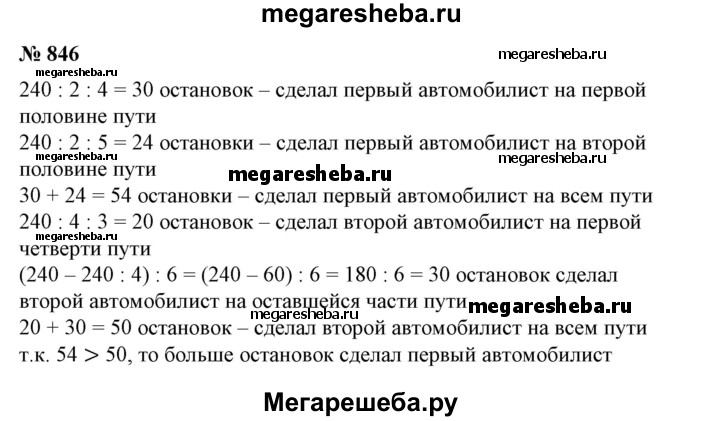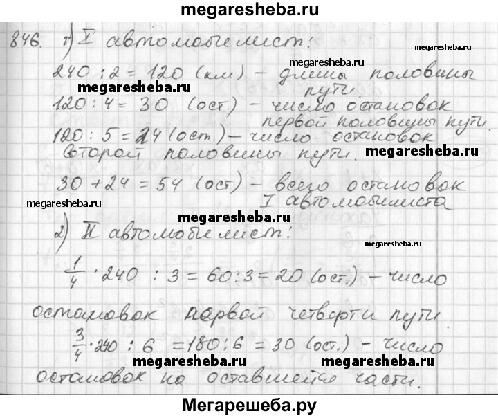 846 Два автомобилиста проехали по 240 км. Первый половину всего пути делал остановки через каждые 4 км, а другую половину — через каждые 5 км. Второй четверть всего пути делал остановки через каждые 3 км, а оставшуюся часть — через каждые 6 км. Какой автомобилист сделал остановок больше?