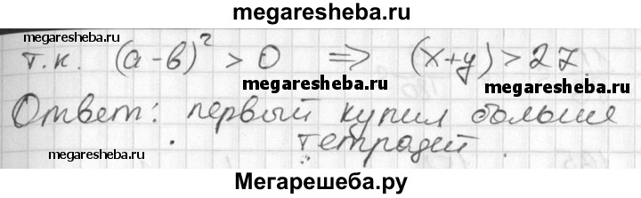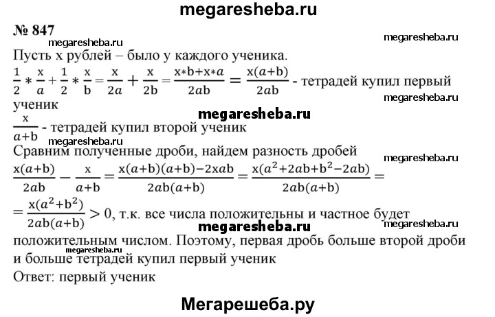 847 Двое учащихся на одинаковую сумму денег купили тетради: тонкие по а рублей за тетрадь и толстые по b рублей за тетрадь. Первый из них половину своих денег истратил на тонкие тетради и половину — на толстые. Второй купил на свои деньги тех и других тетрадей поровну. Кто из них купил большее число тетрадей?