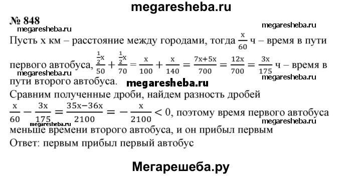 848 Два автобуса отправились одновременно из одного города в другой по одной и той же дороге. Первый двигался с постоянной скоростью 60 км/ч. Второй половину всего пути двигался со скоростью 50 км/ч, а остальную часть пути — со скоростью 70 км/ч. Какой из автобусов первым прибыл во второй город?