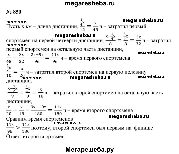 850 На соревнованиях по спортивной ходьбе первый спортсмен прошел четверть всей дистанции со скоростью 12 км/ч, а остальную часть — со скоростью 8 км/ч. Второй спортсмен прошел половину дистанции со скоростью 10 км/ч, а остальную часть — со скоростью 9 км/ч. Кто из них был первым на финише?
