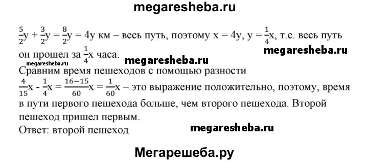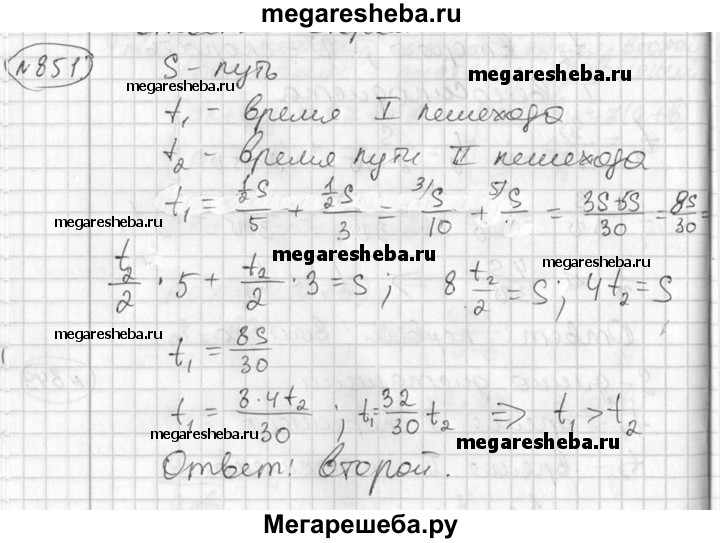 851 Два пешехода прошли одинаковый путь. Первый половину всего пути шел со скоростью 5 км/ч, а оставшуюся часть пути — со скоростью 3 км/ч. Второй пешеход половину всего затраченного времени шел со скоростью 5 км/ч, а остальное время — со скоростью 3 км/ч. Кто из них быстрее прошел весь путь?