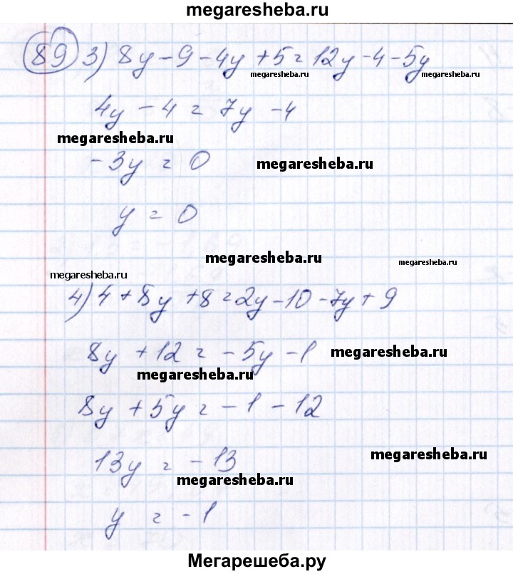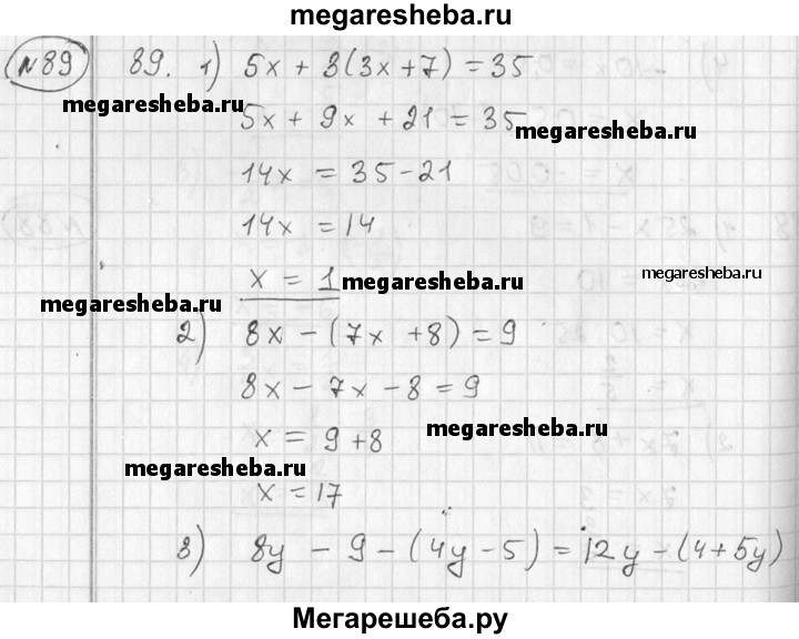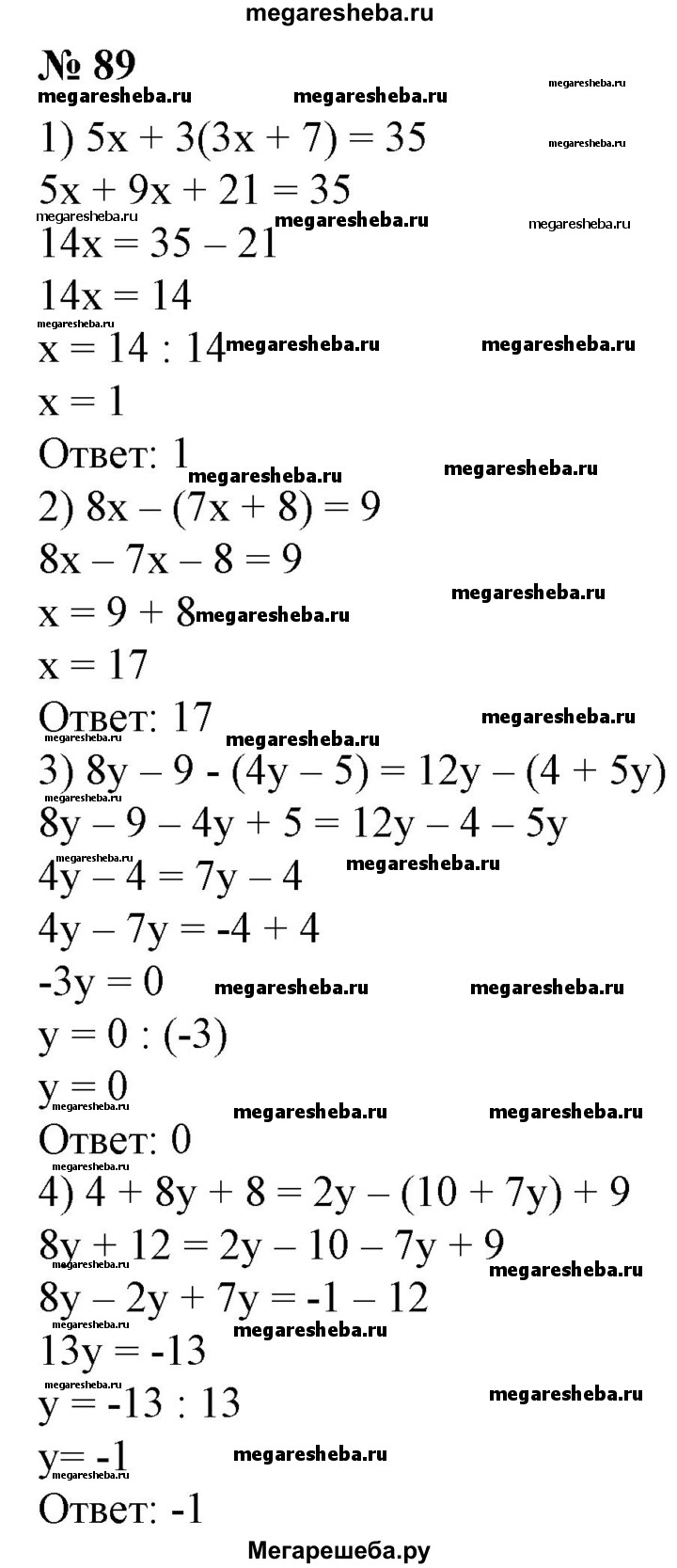 89. 1) 5х + 3(3х + 7) = 35; 2) 8х-(7х + 8) = 9; 3) 8у -9 - (4у - 5) = 12y - (4 + 5у); 4) 4 + 8y + 8 = 2y-(10 + 7y) + 9.
