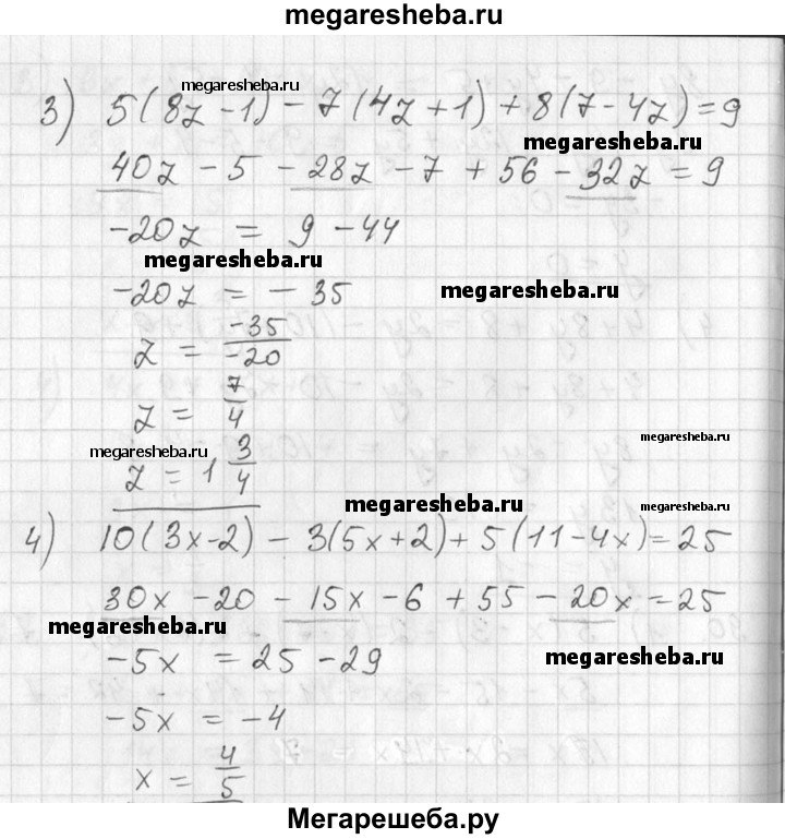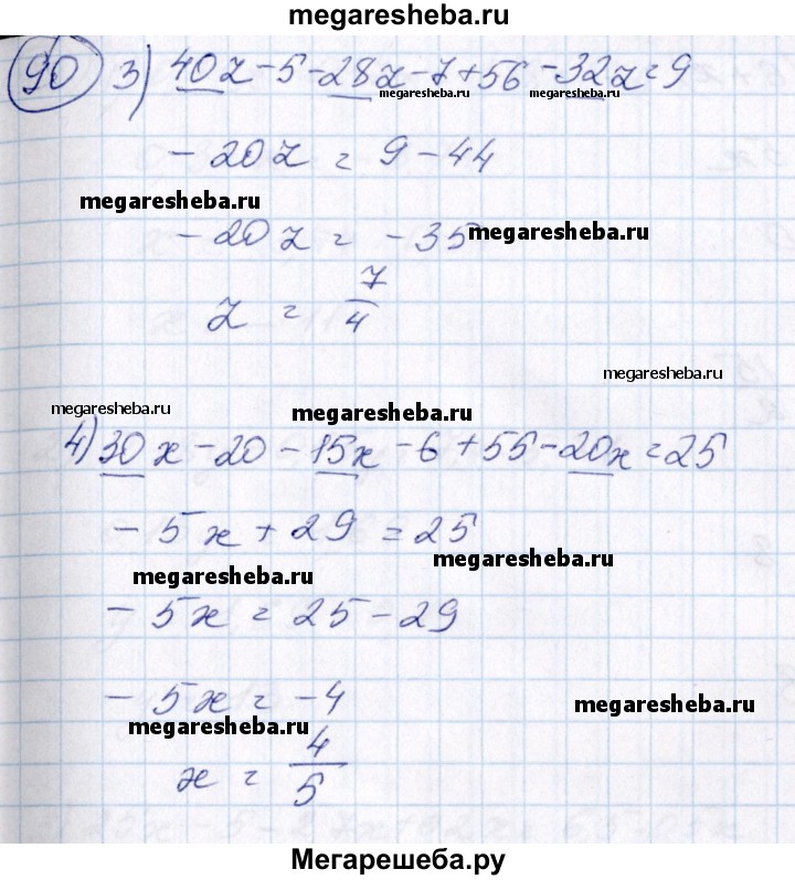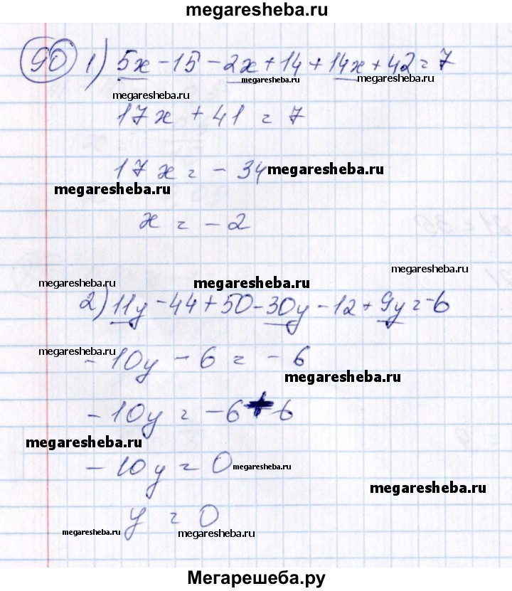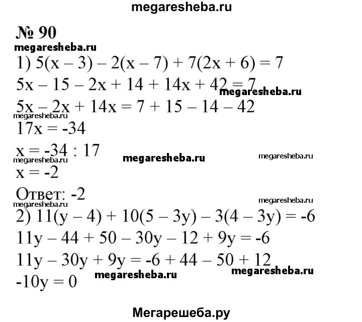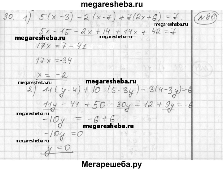 90. 1) 5(х-3)-2(х — 7) + 7(2х + 6) = 7; 2) 11(y- 4) + 10(5 — 3y) - 3(4- Зy) = -6; 3) 5(8z — 1) — 7(4z + 1) + 8(7 - 4z) = 9; 4) 10(3х - 2) -3(5х + 2) + 5(11 -4х) = 25.