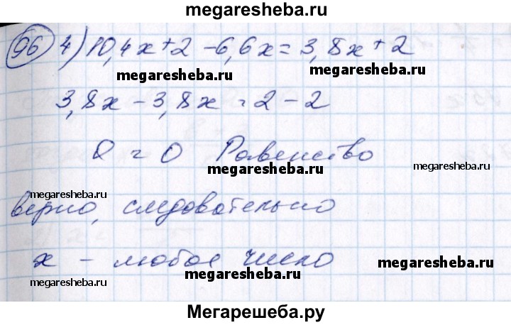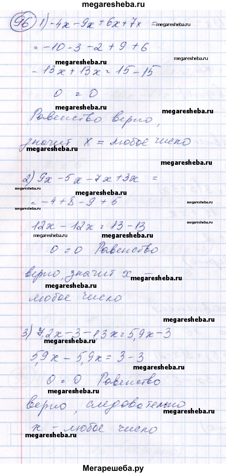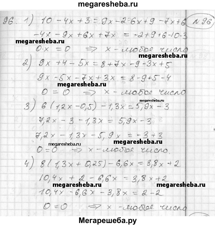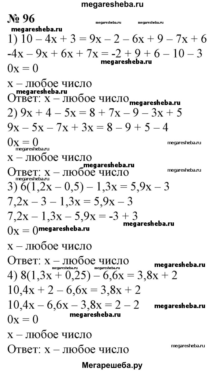 96 Показать, что любое значение х является корнем уравнения: 1) 10-4х + 3 = 9х-2 -6х + 9-7х + 6; 2) 9х + 4-5х = 8 + 7х-9-Зх + 5; 3) 6(1,2х -0,5) - 1,3х = 5,9х - 3; 4) 8 (1,3х + 0,25) - 6,6х = 3,8х + 2.