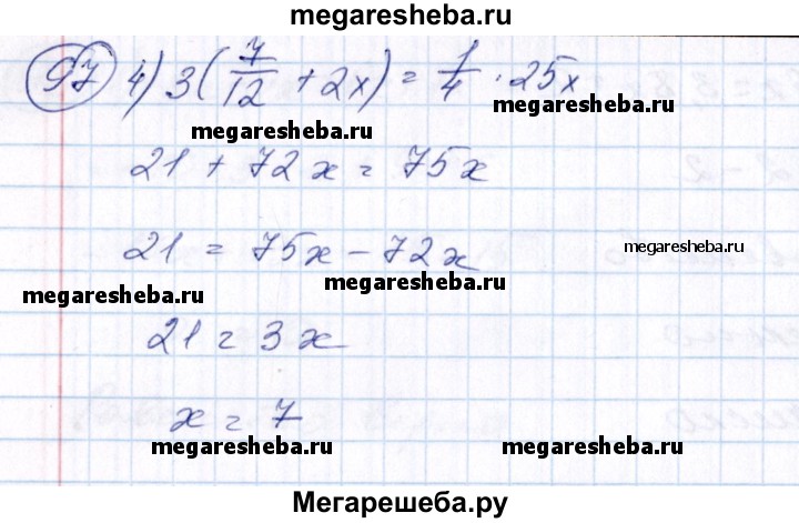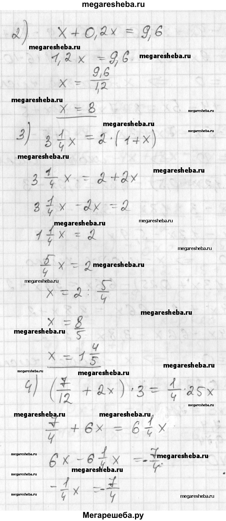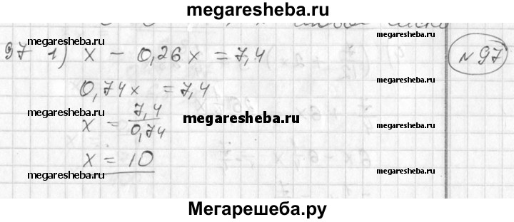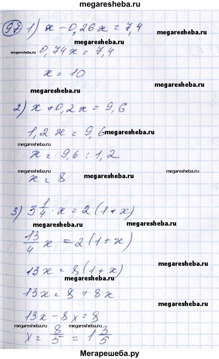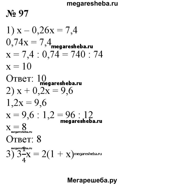 97 По тексту высказывания составить уравнение и решить его: 1) если число х уменьшить на 26%, то получится число 7,4; 2) если число х увеличить на 20%, то получится число 9,6; 3) произведение чисел 3 1/4 и х в 2 раза больше суммы чисел , 4 1 и х; 4) сумма чисел 7/12 и 2х в 3 раза меньше одной четвертой числа 25х.