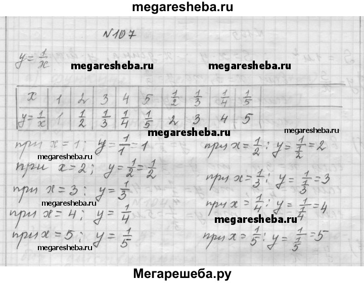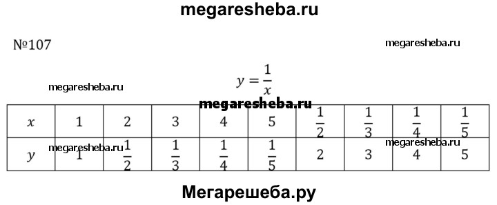 107. Вычислите значение функции у = 1/x при х, равном 1, 2, 3, 4, 5, 1/2, 1/3, 1/4, 1/5. Результаты занесите в таблицу.