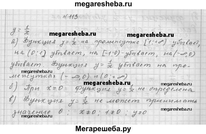 113. а) Возрастает или убывает функция у = 1/x на промежутках [1; + ∞), (0; 1], [-1; 0), (- ∞; 0)? б) При каком значении х функция у = 1/x не определена? в) Может ли функция y = 1/x принять значение О?