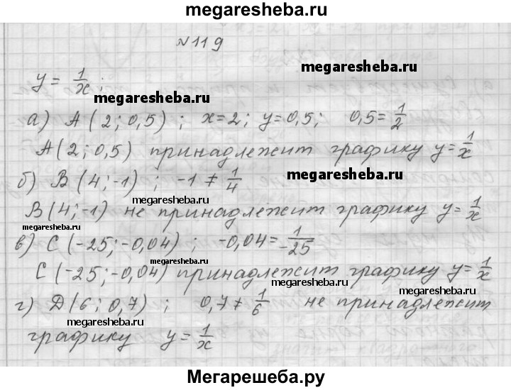 119. Принадлежит ли графику функции у = 1/x точка: а) А(2; 0,5); б) В(4;-1); в) С(-25;-0,04); г) D(6; 0,7)?
