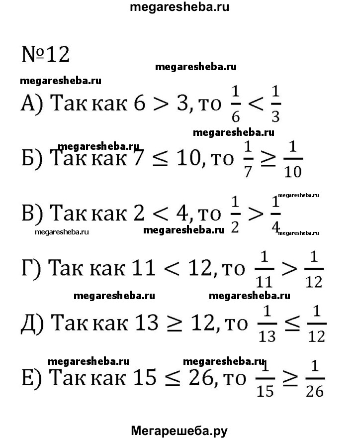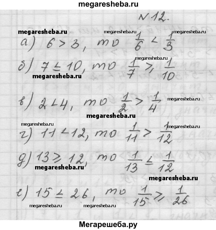 12. Запишите неравенство, которое получится, если числа в левой и правой частях неравенства заменить на обратные им числа. Например, так как 5 < 6, то 1/5 > 1/6. а) 6 > 3; б) 7 ^ 10; в) 2 < 4; г) 11 <12; д) 13 >12; е) 15 ≤ 26.