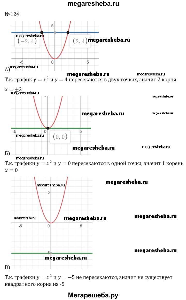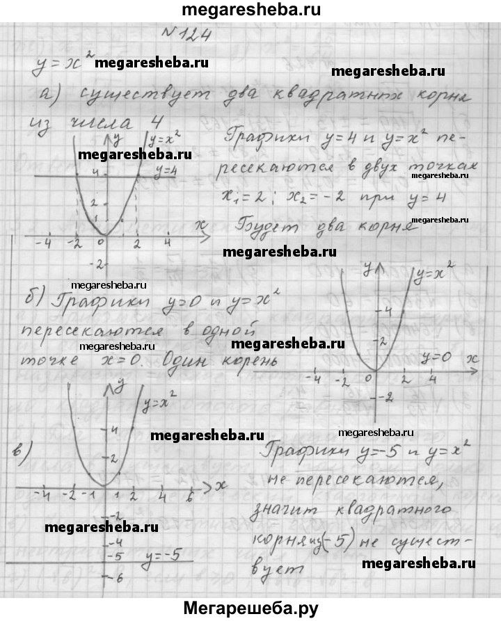124. Покажите с помощью графика функции у = х2, что: а) существуют два квадратных корня из числа 4; б) существует единственный квадратный корень из числа 0; в) не существует действительных чисел — квадратных корней из числа -5.