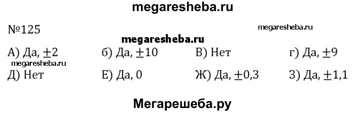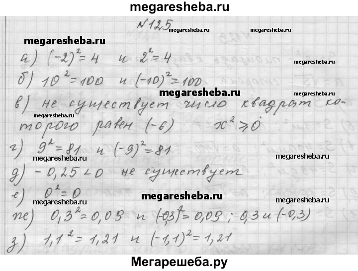 125. Существует ли число, квадрат которого равен: а) 4; б)100; в)-6; г) 81; д)-0,25; е) 0; ж) 0,09; з) 1,21?