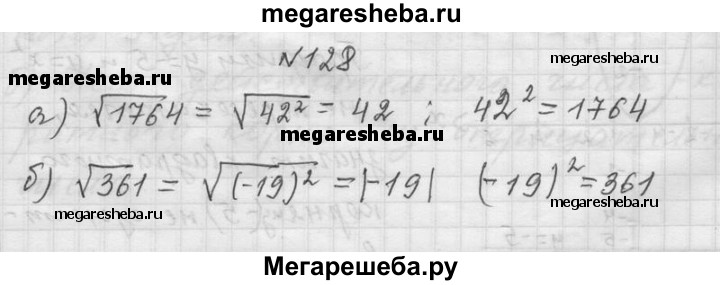 128. Проверьте, является ли число: а) 42 квадратным корнем из 1764; б) -19 квадратным корнем из 361.