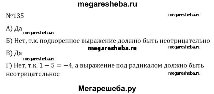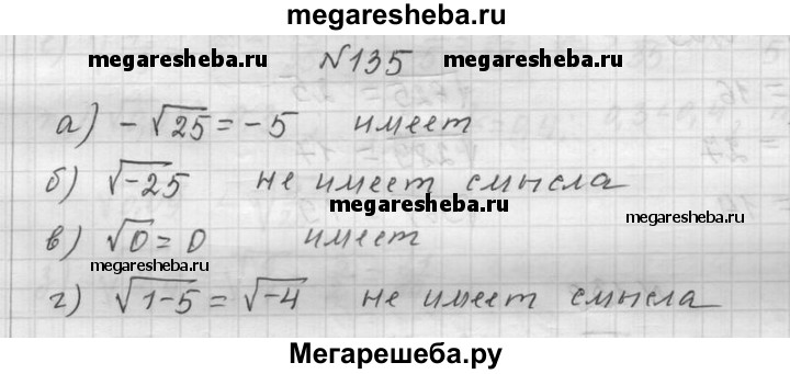 135. Имеет ли смысл выражение: а) -√25; б) √-25; в) √0; г) √1 - 5?