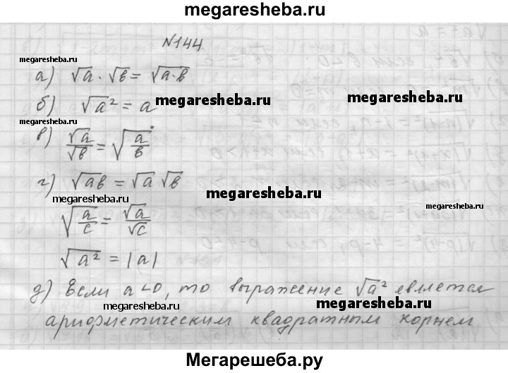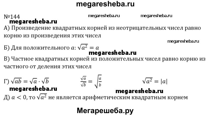 144. а) Чему равно произведение квадратных корней из неотрицательных чисел? б) Чему равен √a2 для положительного числа а? в) Чему равно частное квадратных корней из положительных чисел? г) Перечислите свойства арифметических квадратных корней. д) Если а < 0, то является ли выражение √а2 арифметическим квадратным корнем?