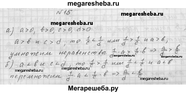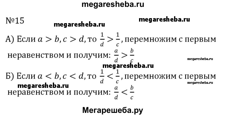 15. Докажите для положительных чисел а, b, с и d, что: а) если а > b и с > d, то a/d > b/c; б) если а < b и с < d, то a/d < b/c.