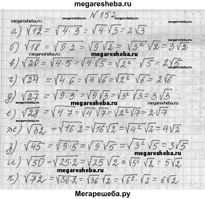 152. Вынесите множитель из-под знака корня Указание. В сложных случаях полезно разложить подкоренное выражение на простые множители и выделить квадраты этих множителей, если они имеются.