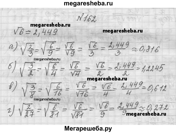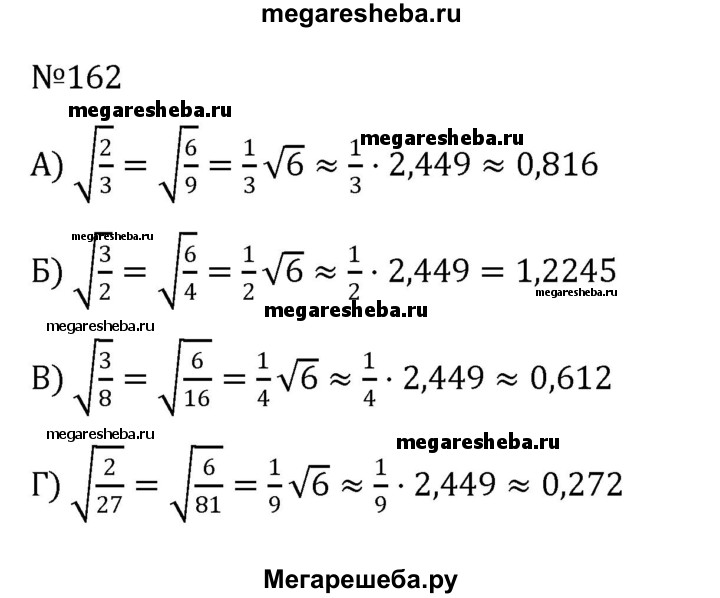 162. Зная приближённое значение √6≈2,449, вычислите приближённо: а) √2/3 б) √3/2 в) √3/8 г) √2/27