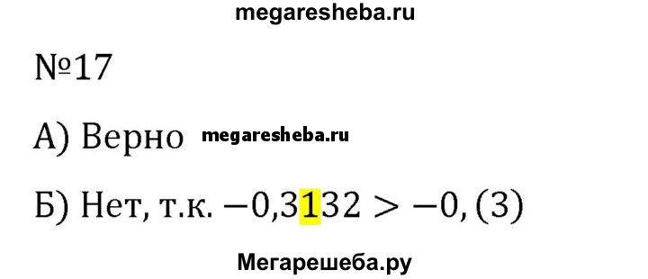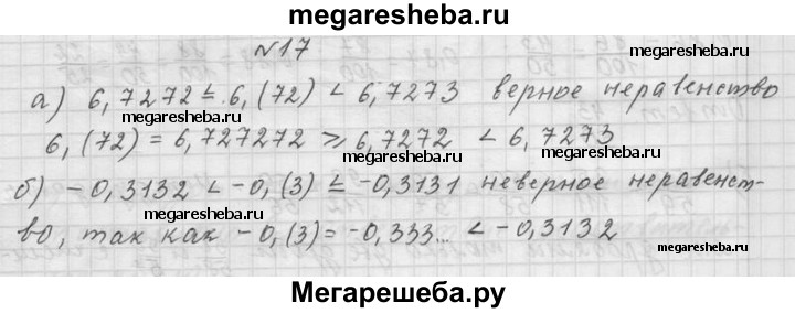 17. Верно ли неравенство: а) 6,7272 ≤ 6,(72) < 6,7273; б) -0,3132 <-0,(3) ≤ -0,3131?