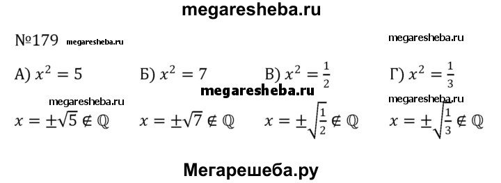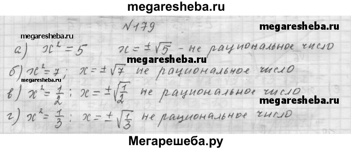 179. Докажите, что не существует рационального числа, квадрат которого равен: , 1 а) 5; б) 7; в) 1/2 г) 1/3.