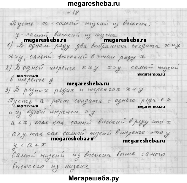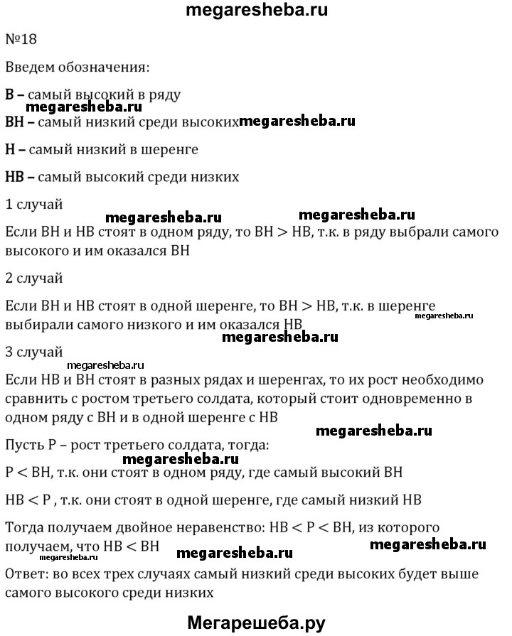 18. Солдат построили не по росту, но с чётким разделением на ряды и шеренги. В каждом ряду выбрали самого высокого, а из всех высоких — самого низкого. В каждой шеренге выбрали самого низкого, а из всех низких — самого высокого. Кто же выше ростом: самый низкий из высоких или самый высокий из низких? Указание. Рассмотрите случаи, когда два выбранных солдата стоят: 1) в одном ряду; 2) в одной шеренге; 3) в разных рядах и шеренгах.