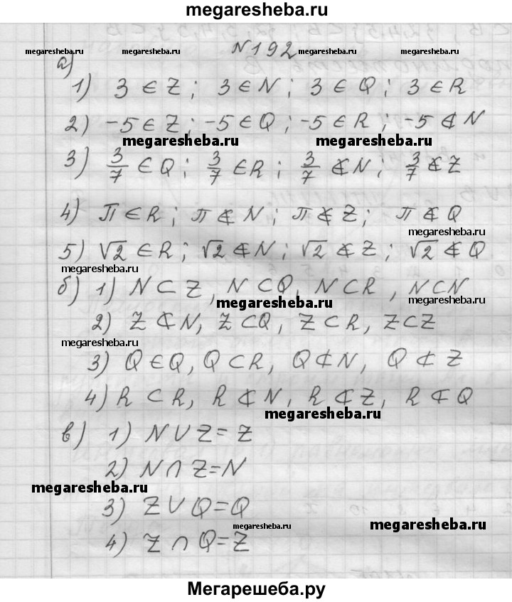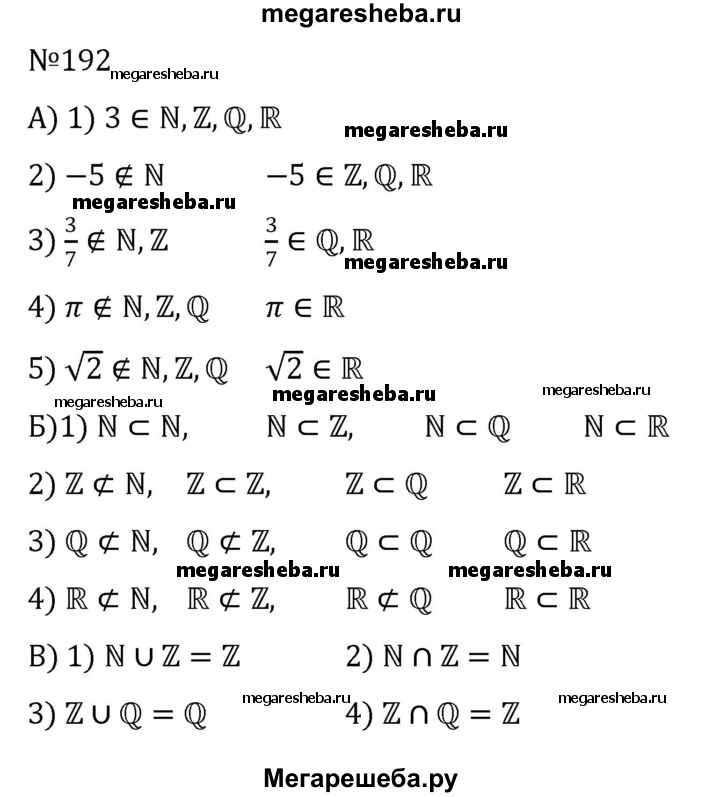 192. N, Z, Q, R соответственно множества натуральных, целых, рациональных и действительных чисел. а) Запишите, используя принятые обозначения, какому из этих множеств принадлежит, а какому не принадлежит число: 1) 3; 2) -5; 3) 3/7 4) π 5) √2. б) Запишите, используя принятые обозначения, подмножеством каких из множеств N, Z, Q и R является множество: 1) N; 2) Z; 3) Q; 4) R. в) Упростите запись: 1) N U Z; 2) N ∩ Z; 3) Z U Q; 4) Z ∩ Q.