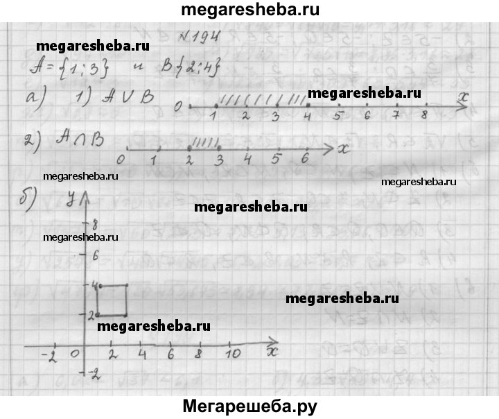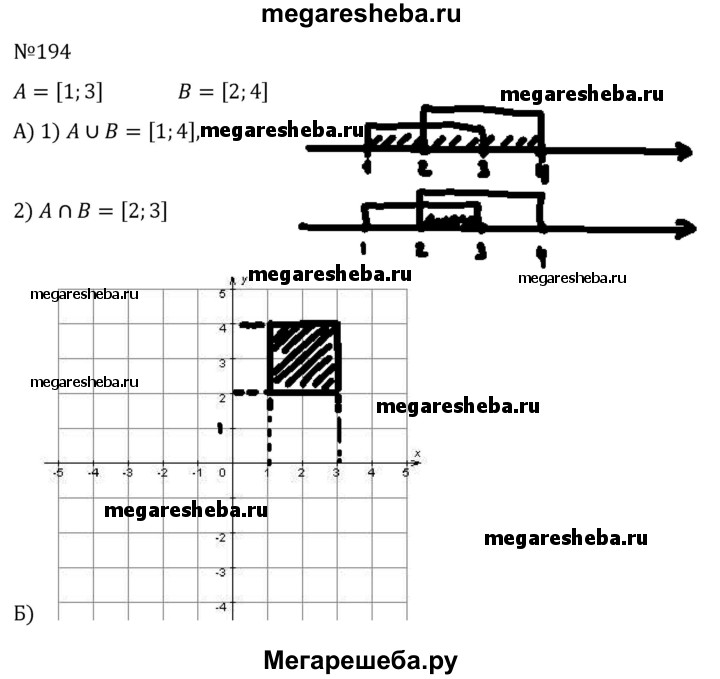 194. Даны два множества: А = [1; 3] и В = [2; 4]. а) Изобразите на координатной оси множество: 1) A U В; 2) А ∩ В. б) Изобразите в системе хОу все точки, координаты которых (x; у) являются элементами множества А х В.