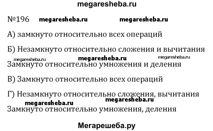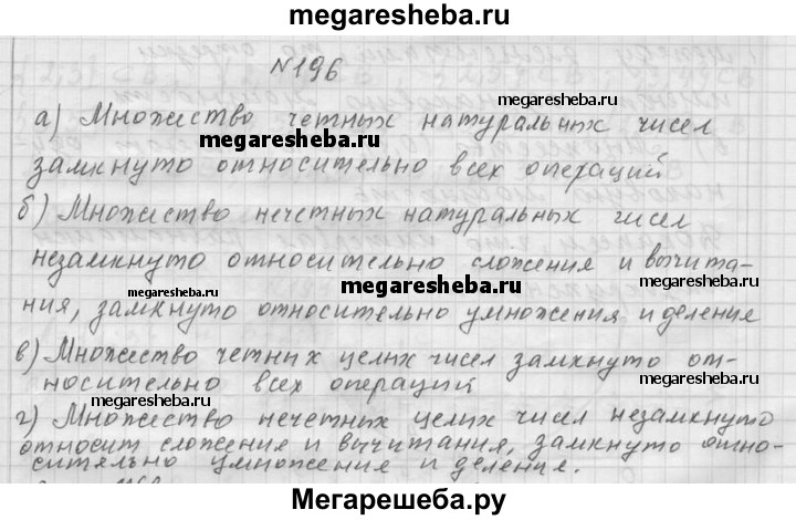 196. Является ли замкнутым относительно операции сложения, вычитания, умножения, деления множество: а) чётных натуральных чисел; б) нечётных натуральных чисел; в) чётных целых чисел; г) нечётных целых чисел?