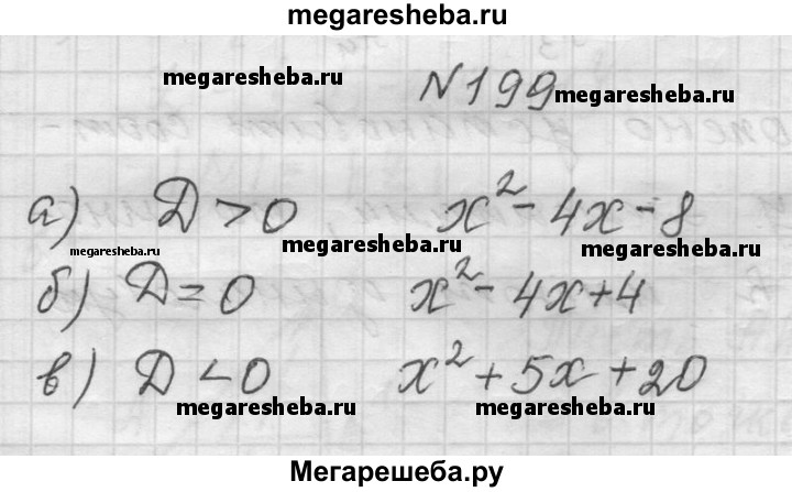 199. Приведите пример квадратного трёхчлена, дискриминант которого: а) больше нуля; б) равен нулю; в) меньше нуля.