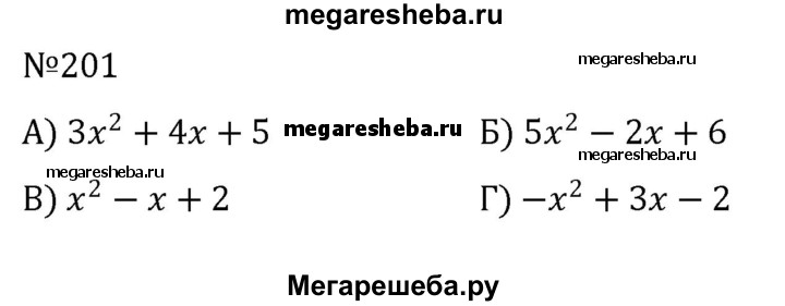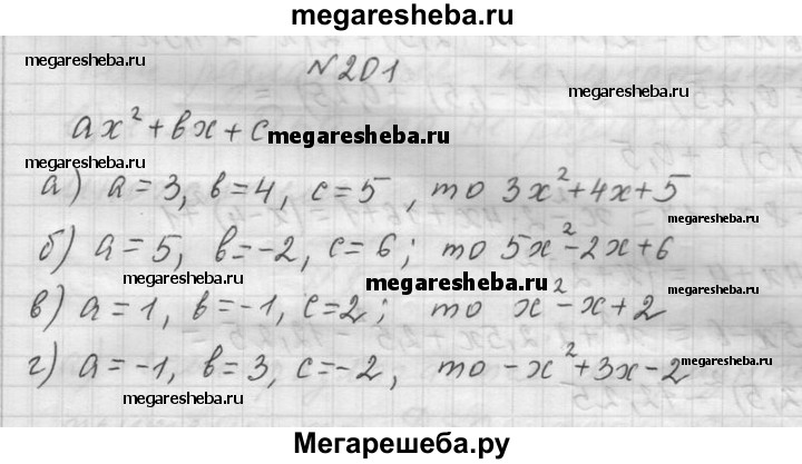 201. Составьте квадратный трёхчлен ах2 + bх + с, если даны его коэффициенты и свободный член: а) а = 3, b = 4, с = 5; б) а = 5, b = -2, с = 6; в) а = 1, b = -1, с = 2; г) а = -1, b = 3, с = -2.