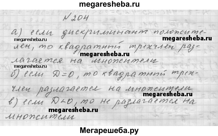204. Разлагается ли квадратный трёхчлен на линейные множители, если его дискриминант: а) положителен; б) равен нулю; в) отрицателен?