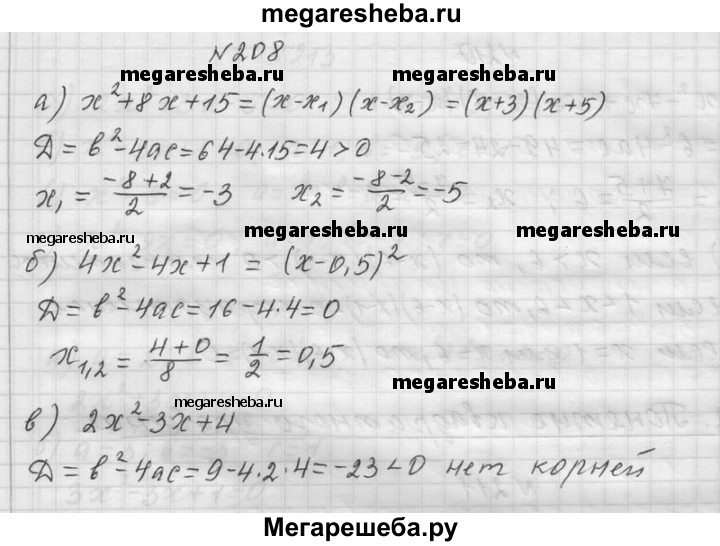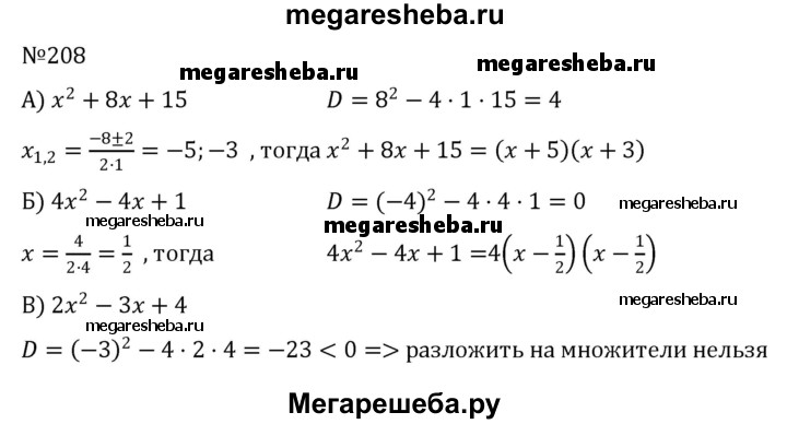 208. Разложите квадратный трёхчлен на линейные множители, если это возможно (если нет, то укажите причину): а) х2 + 8х + 15; б) 4х2 - 4х + 1; в) 2х2 - Зх + 4.