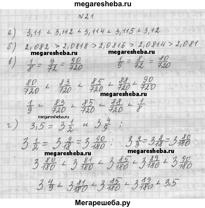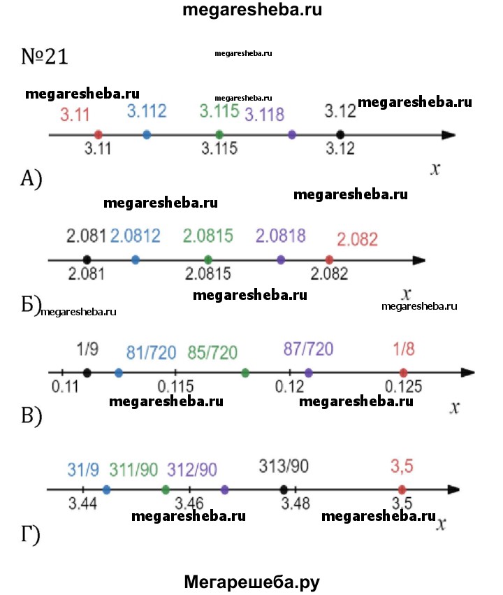21. Укажите хотя бы три числа, находящиеся на координатной оси между числами: а) 3,11 и 3,12; б) 2,082 и 2,081; в) 1/8 и 1/9; г) 3,5 и 3*4/9.