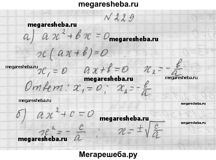 229. Запишите общий вид квадратного уравнения: а) один корень которого равен нулю, а другой не равен нулю; б) корни которого равны по абсолютной величине, но противоположны по знаку. Как решается каждое из этих уравнений?