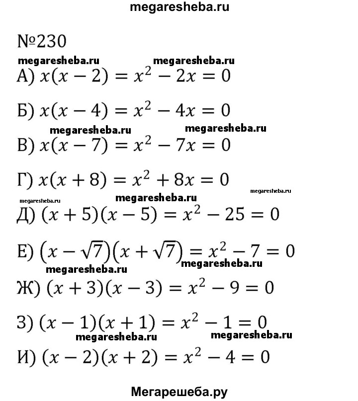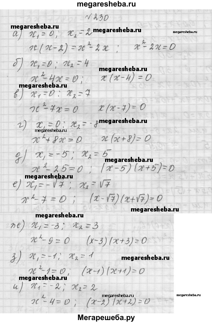 230. Запишите квадратное уравнение, корни которого: а) 0 и 2; б) 0 и 4; в) 0 и 7; г) 0 и -8; д) -5 и 5; е) -√7 и √7; ж) -3 и 3; з) -1 и 1; и) -2 и 2.